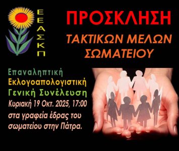 ΠΡΟΣ: ΤΑΚΤΙΚΟ ΜΕΛΟΣ ΣΩΜΑΤΕΙΟΥ ΕΕΑΣΚΠ ΘΕΜΑ: ΠΡΟΣΚΛΗΣΗ ΣΤΗΝ ΕΠΑΝΑΛΗΠΤΙΚΗ ΕΚΛΟΓΟΑΠΟΛΟΓΙΣΤΙΚΗ ΓΕΝΙΚΗ ΣΥΝΕΛΕΥΣΗ ΤΗΝ ΚΥΡΙΑΚΗ 19…
