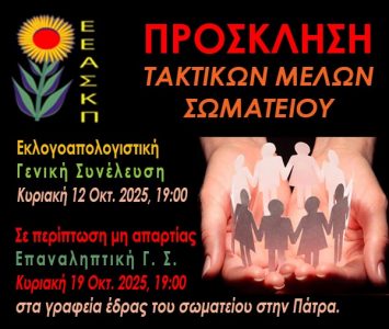 ΠΡΟΣ: ΤΑΚΤΙΚΟ ΜΕΛΟΣ ΣΩΜΑΤΕΙΟΥ ΕΕΑΣΚΠ ΘΕΜΑ: ΠΡΟΣΚΛΗΣΗ ΣΤΗΝ ΕΚΛΟΓΟΑΠΟΛΟΓΙΣΤΙΚΗ ΓΕΝΙΚΗ ΣΥΝΕΛΕΥΣΗ ΤΗΝ ΚΥΡΙΑΚΗ 12 ΟΚΤΩΒΡΙΟΥ…