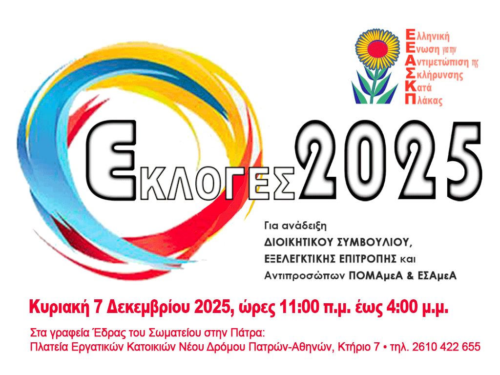 - Θα πραγματοποιηθούν οι Εκλογικές Διαδικασίες για την ανάδειξη οργάνων Διοίκησης της ΕΕΑΣΚΠ (Διοικητικό Συμβούλιο και Εξελεγκτική Επιτροπή) και των Αντιπροσώπων στην ΠΟΜΑμεΑ καιΕΣΑμεΑ την Κυριακή 7 Δεκεμβρίου 2025, από τις 11:00 π.μ. έως τις 4:00 μ.μ., στα γραφεία της ΕΕΑΣΚΠ στην έδρα της, όπως αποφασίστηκε στην Επαναληπτική Εκλογοαπολογιστική Γενική Συνέλευση που πραγματοποιήθηκε στις 19 Οκτωβρίου 2025.